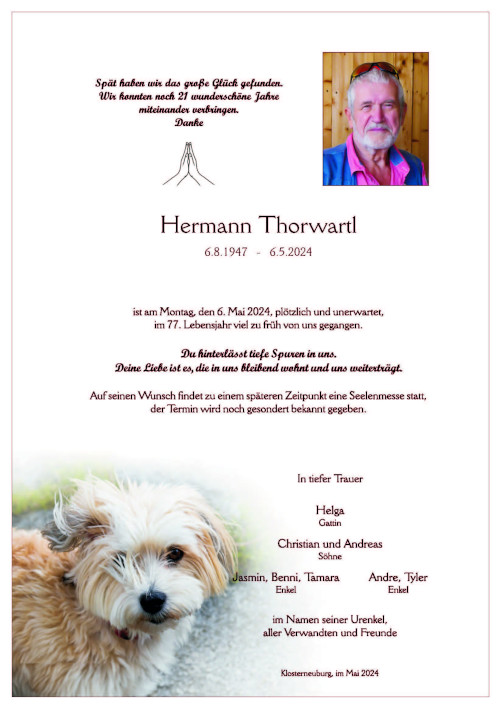 Mit großer Betroffenheit, haben wir die Nachricht erhalten, dass Hermann Thorwartl unerwartet verstorben ist.